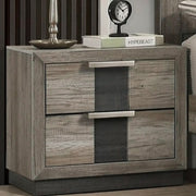 Crown Mark Furniture Rangley 2 Drawer Nightstand in Brown B6830-2. Upgrade the allure of your bedroom with this gorgeous 2-drawer nightstand The grey and black finish enhances the nightstand's sleek and contemporary design, while the metal drawer pulls lend a touch of flair to the overall aesthetic. With two spacious drawers, you'll have plenty of room to store all of your nighttime essentials. Besides serving as a functional and convenient storage solution, this nightstand is sure to bring a touch of understated elegance to your bedroom decor.